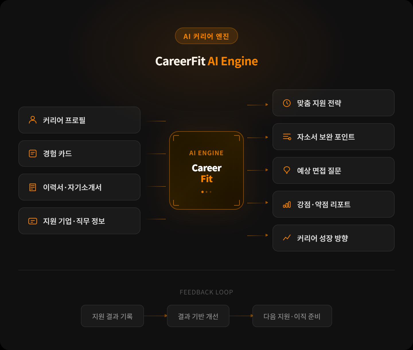 커리어 정보 입력부터 지원 전략, 보완 포인트, 예상 면접 질문, 강점·약점 리포트, 성장 방향까지 하나의 흐름으로 연결합니다.
